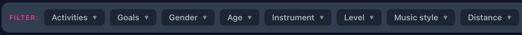 Within each filter, e.g. under instrument, if you select ‘guitar’ and ‘violin’, then both belong to the selection.